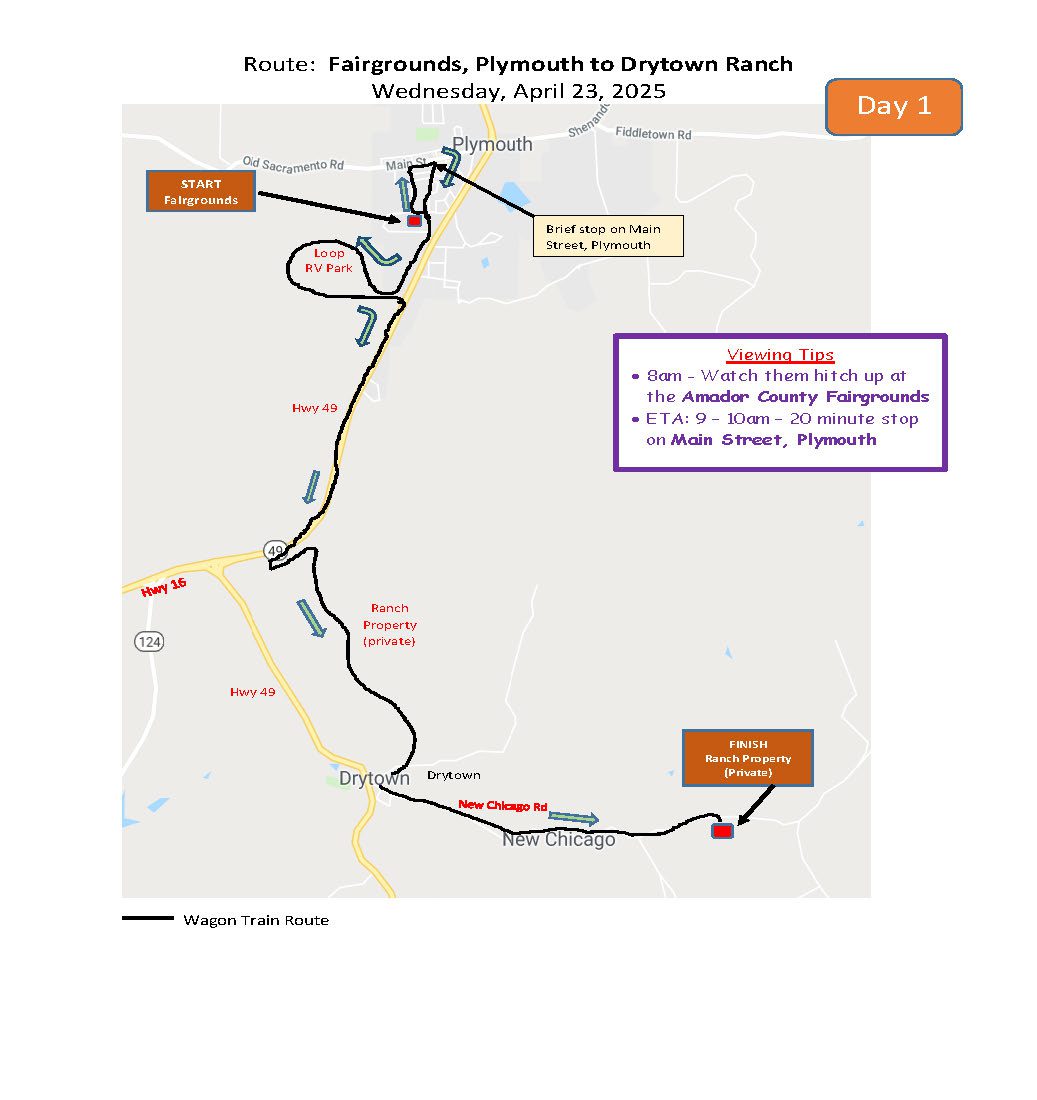 APRIL 23 – 27, 2025, the 11th annual Kit Carson Mountain Men Wagon Train will trek for five days on back roads and Old Highway 49, starting in Plymouth and visiting Amador County’s historic Main Streets along the way. The Wagon Train features beautiful teams of horses handled by dedicated drivers who welcome the opportunity to share their love of history with the public. The authentic horse-drawn covered wagons circle up each afternoon and evening to rest and visit with the public.